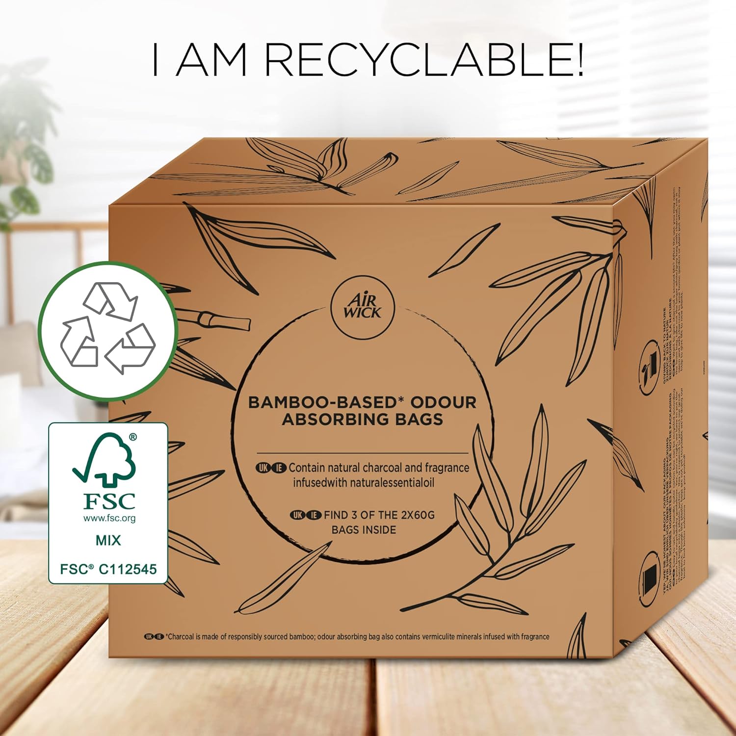 - Box contents: 6 x 60 g Air Wick odour-absorbing bamboo activated carbon fragrance cushion / air neutraliser and dehumidifier with natural ingredients / in FFP packaging