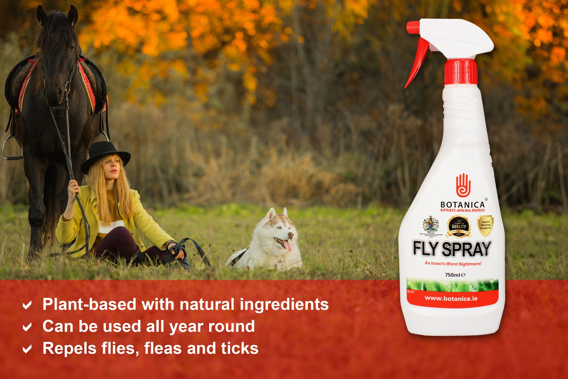 Protect your animals naturally with Botanica International Fly Spray, a safe and effective solution to repel flies and other insects while keeping your pets and horses comfortable.