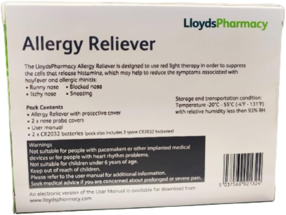 - The allergy reliever from LloydsPharmacy uses red light therapy to suppress the cells that release histamine.