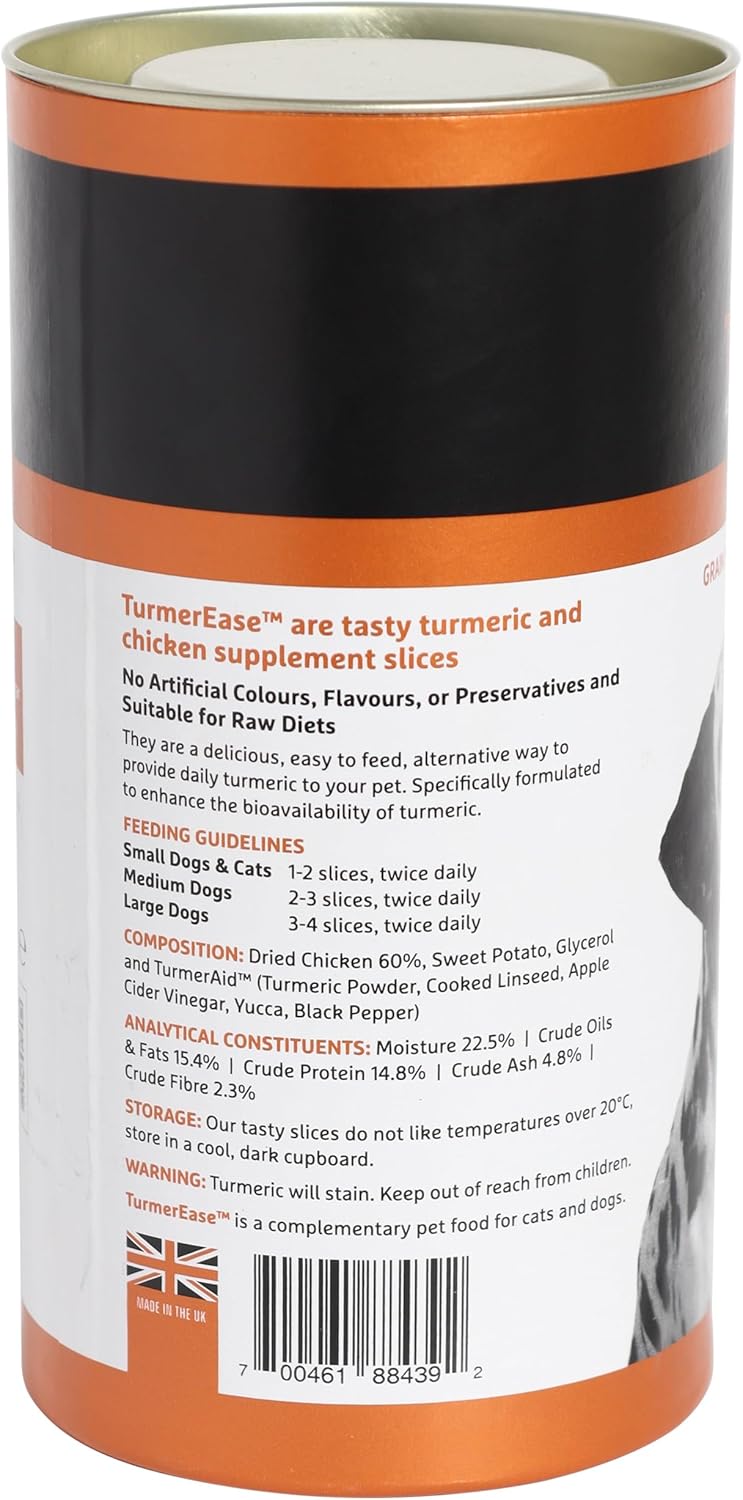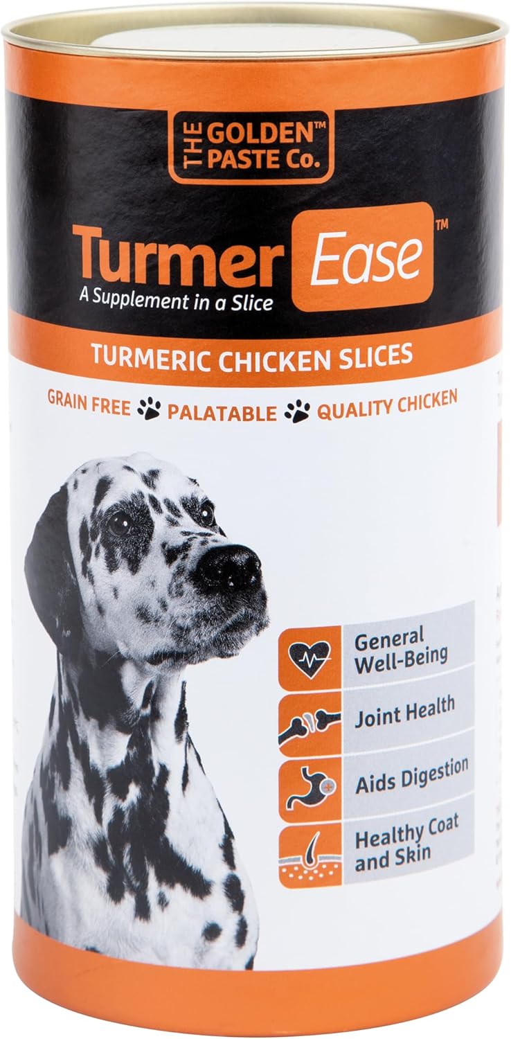 - Skin and Coat: TurmerEase Chicken and Turmeric Slices are dog & cat treats that enhance a healthy and shiny coat. Free from artificial colours, flavours, or preservatives, they are suitable for all ages.