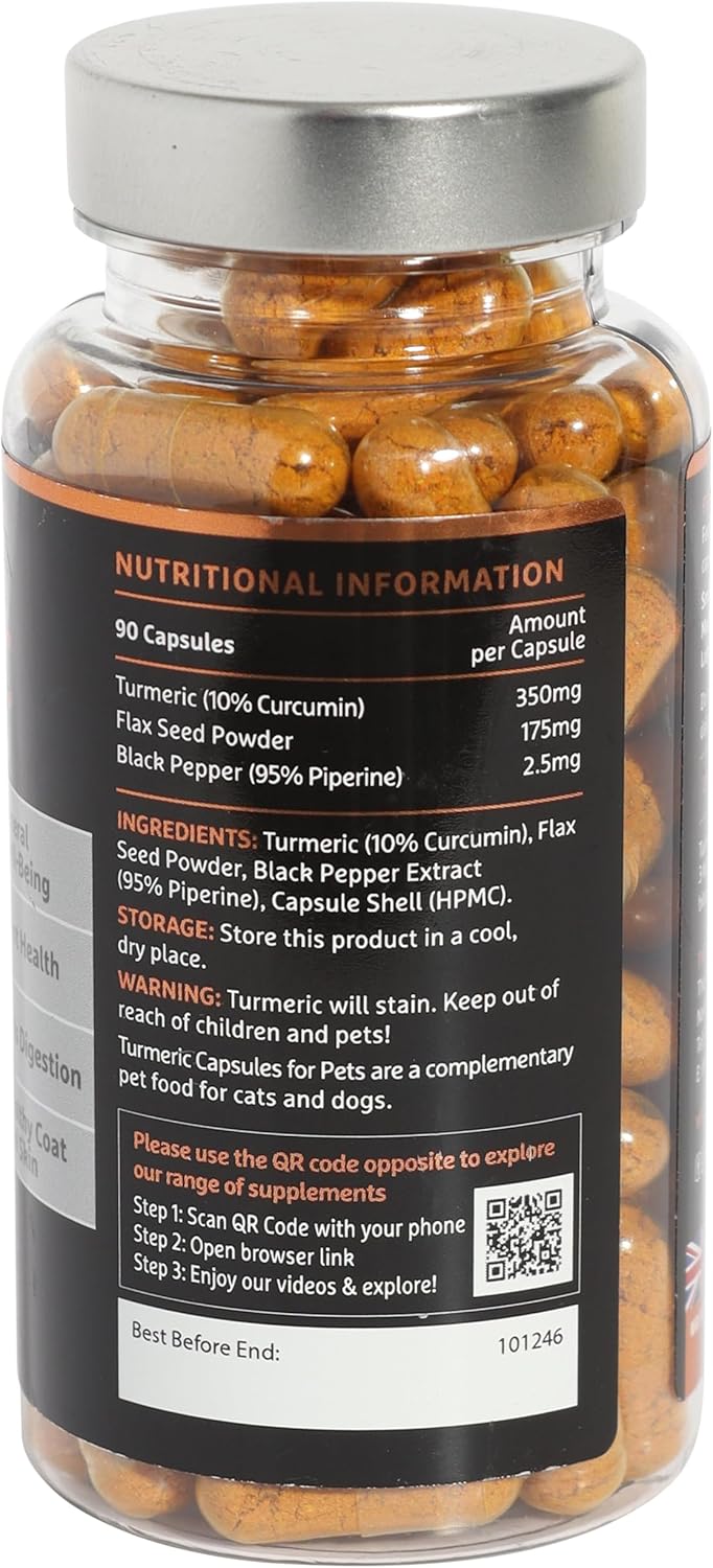 - Skin and Coat Supplement: Our premium natural turmeric capsules enhance a healthy and shiny coat. Free from artificial colours, flavours, or preservatives, they are suitable for pets of all ages.